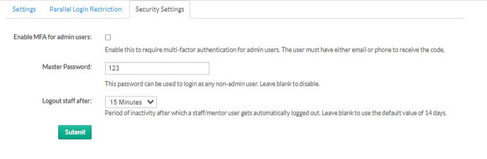 Choose how long a staff or mentor can stay inactive before being logged out automatically. Leave blank to use the default timeout of 14 days.