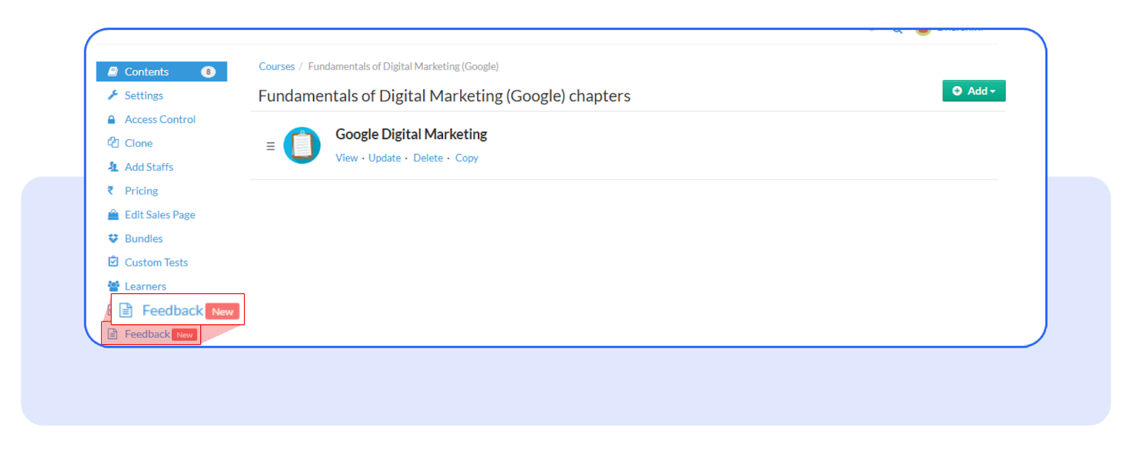 • From the admin panel, toggle the Feedback feature on for the course you want to collect feedback from.