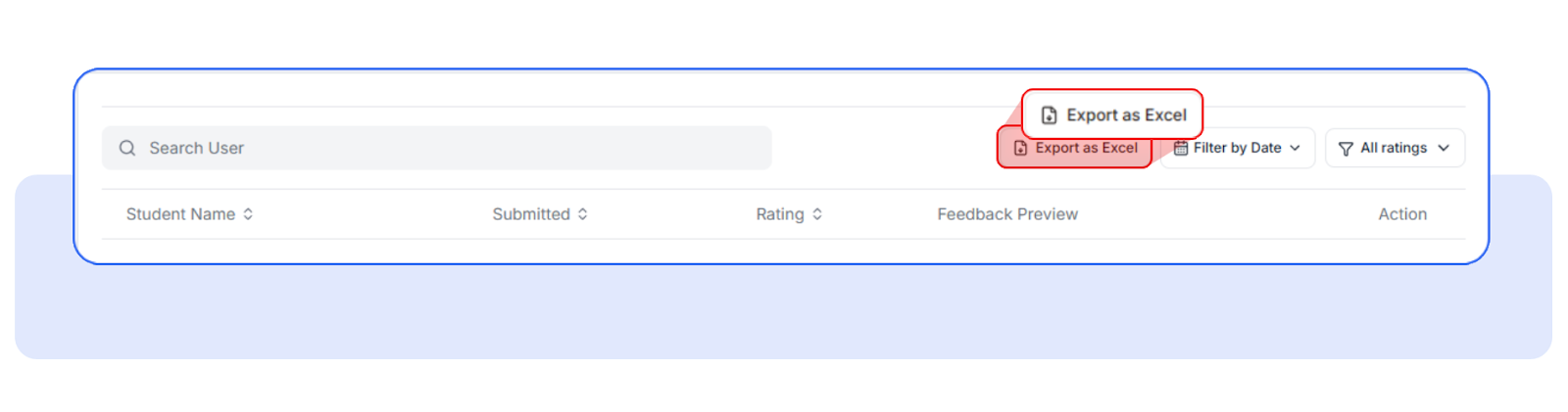 • Admins can view aggregated results and export the data to Excel for detailed analysis.