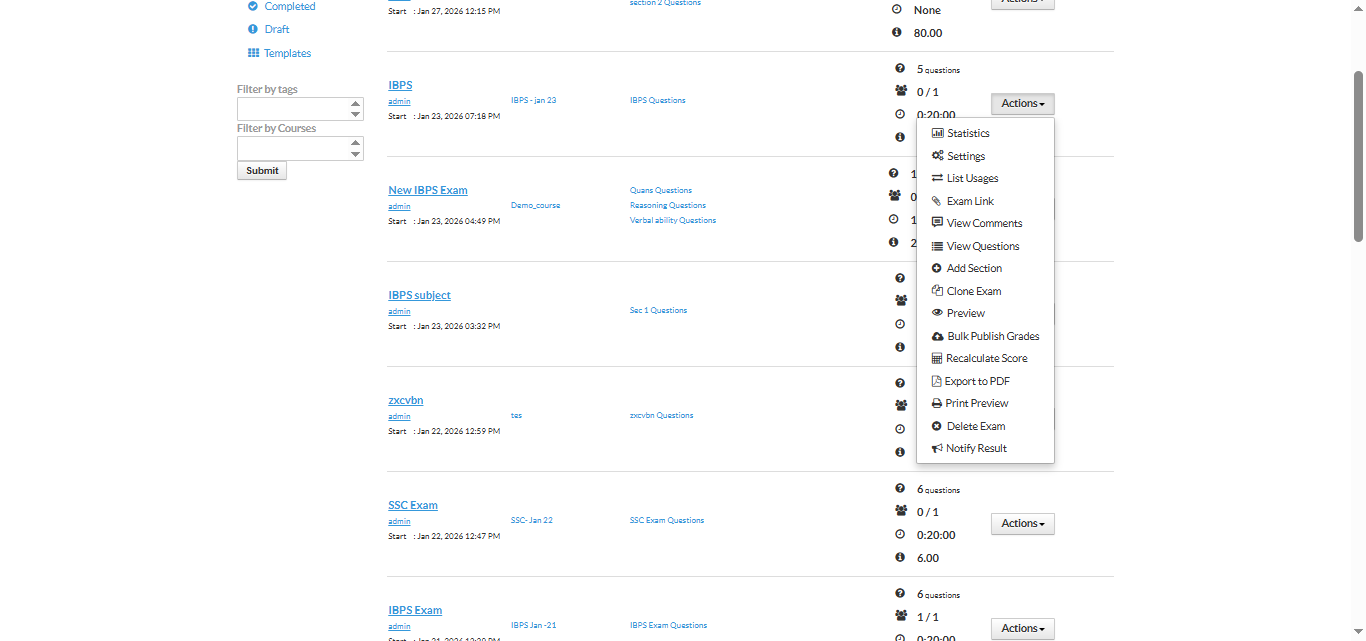 3. Select the exam for which you want to download the report and click on Statistics for the selected exam.