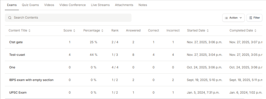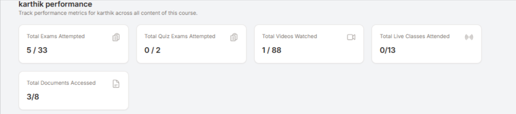 You can now see the learner’s detailed performance like Total exams attempted, quiz attempted, videos watched etc.