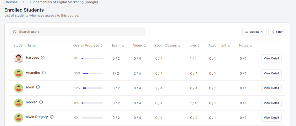 Click on View Detail for a specific learner
