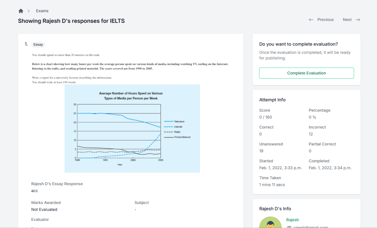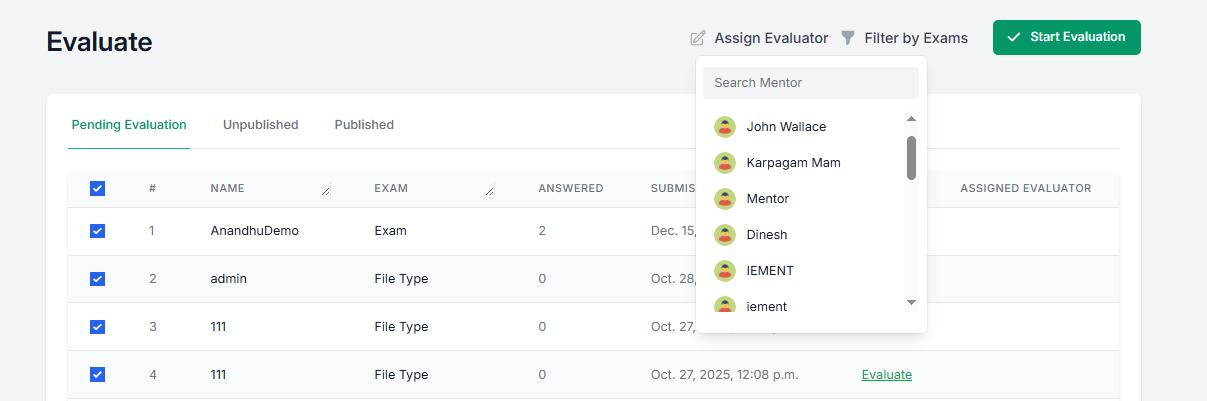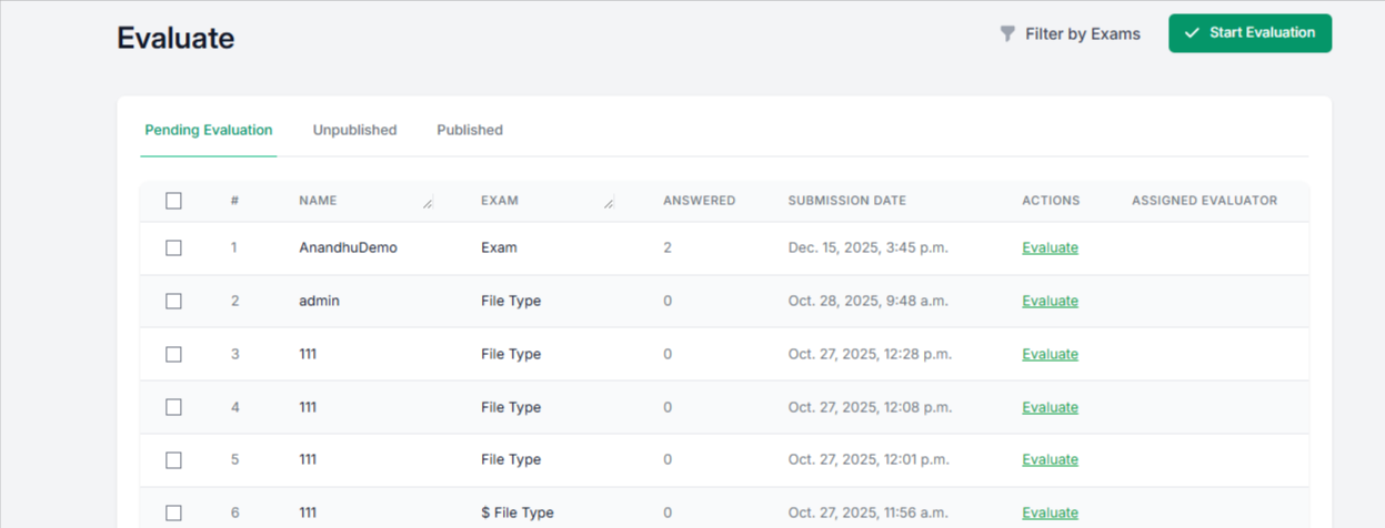 You will see a list of exams that are pending evaluation. Click Start Evaluation on the top right to begin.