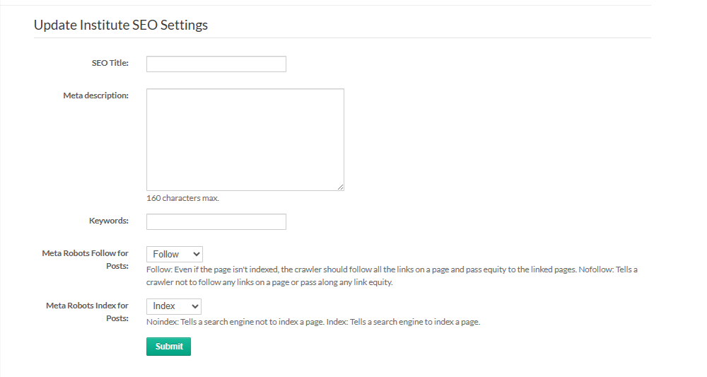 This section allows you to update your institute’s SEO-related information.